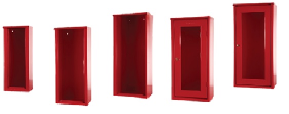 Gabinete para extintor anclado a la pared, fabricado en lámina negra cal. 22, pintado en color rojo brillante; se cuentan con o sin puerta y chapa para proteger los extintores de la intemperie en presentaciones de 2.5, 4.5, 6, 9 y 12 kg